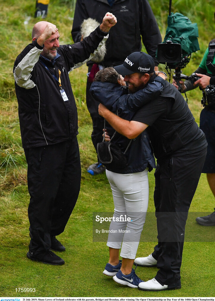 21 July 2019; Shane Lowry of Ireland celebrates with his parents, Bridget and Brendan, after winning The Open Championship on Day Four of the 148th Open Championship at Royal Portrush in Portrush, Co Antrim. Photo by Brendan Moran/Sportsfile