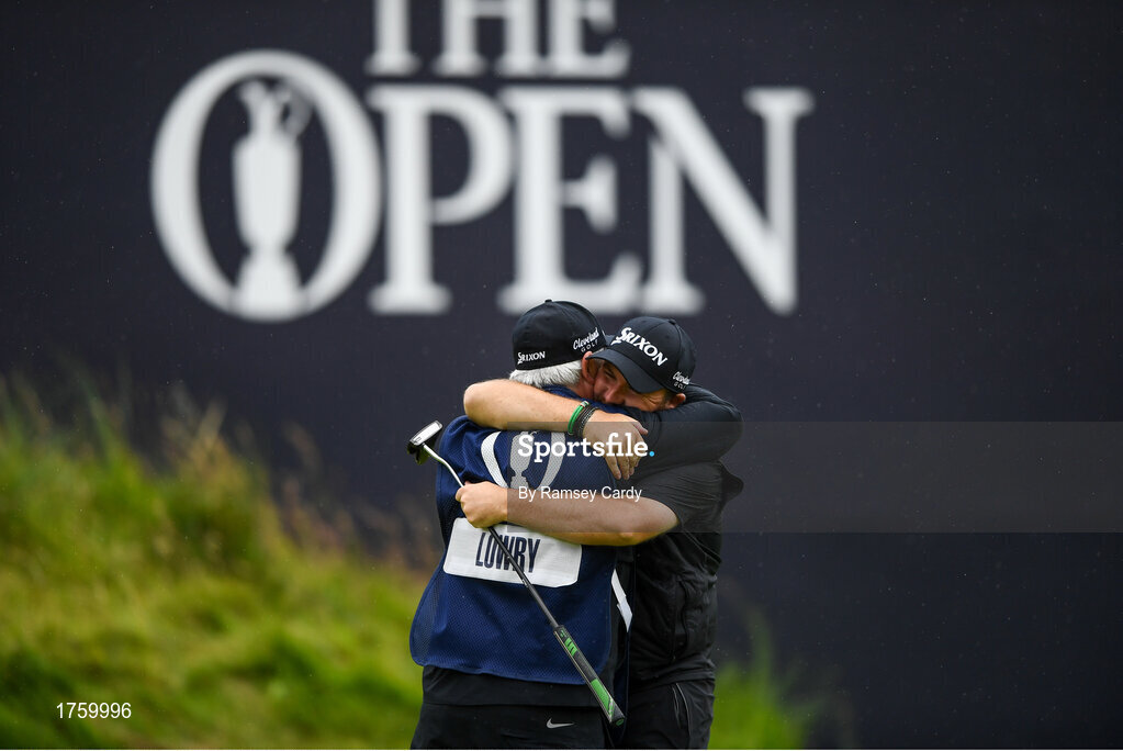 21 July 2019; Shane Lowry of Ireland celebrates with his caddy Brian Martin after winning The Open Championship on Day Four of the 148th Open Championship at Royal Portrush in Portrush, Co Antrim. Photo by Ramsey Cardy/Sportsfile