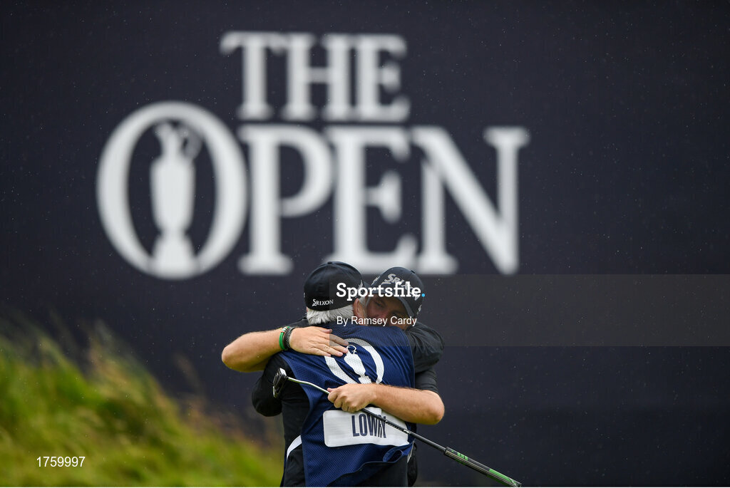 21 July 2019; Shane Lowry of Ireland celebrates with his caddy Brian Martin after winning The Open Championship on Day Four of the 148th Open Championship at Royal Portrush in Portrush, Co Antrim. Photo by Ramsey Cardy/Sportsfile