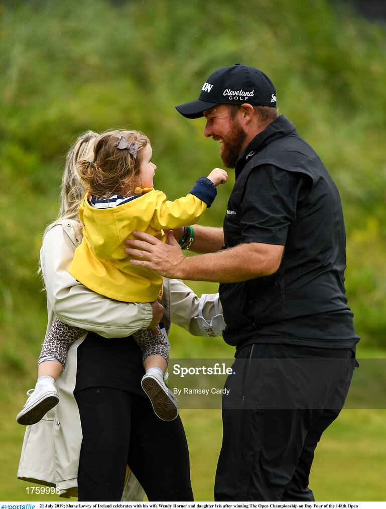 21 July 2019; Shane Lowry of Ireland celebrates with his wife Wendy Honner and daughter Iris after winning The Open Championship on Day Four of the 148th Open Championship at Royal Portrush in Portrush, Co Antrim. Photo by Ramsey Cardy/Sportsfile