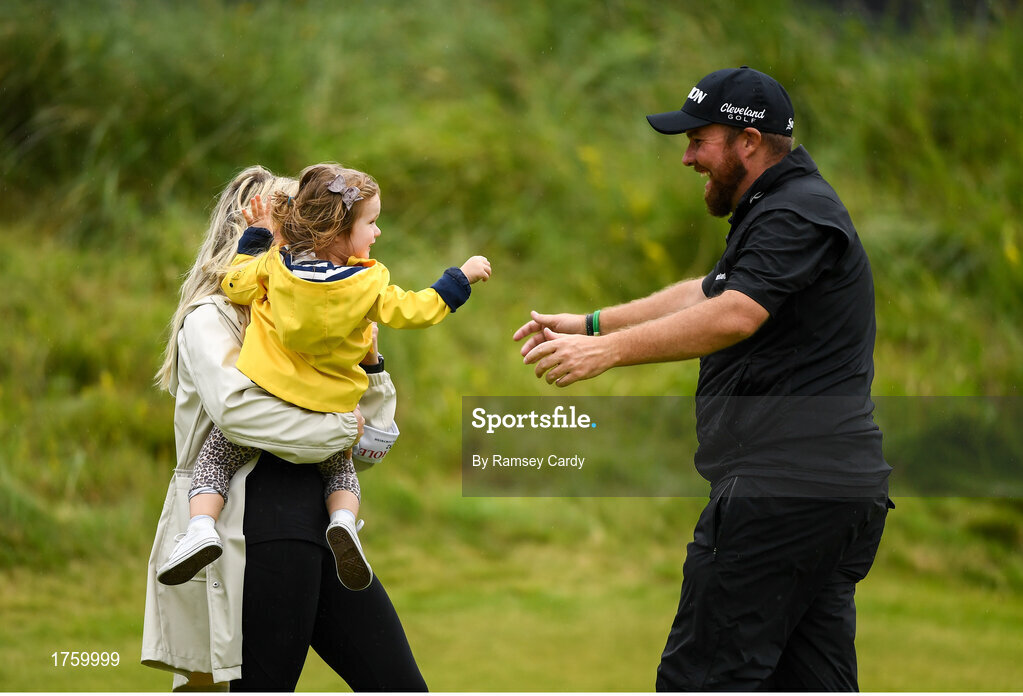 21 July 2019; Shane Lowry of Ireland celebrates with his wife Wendy Honner and daughter Iris after winning The Open Championship on Day Four of the 148th Open Championship at Royal Portrush in Portrush, Co Antrim. Photo by Ramsey Cardy/Sportsfile