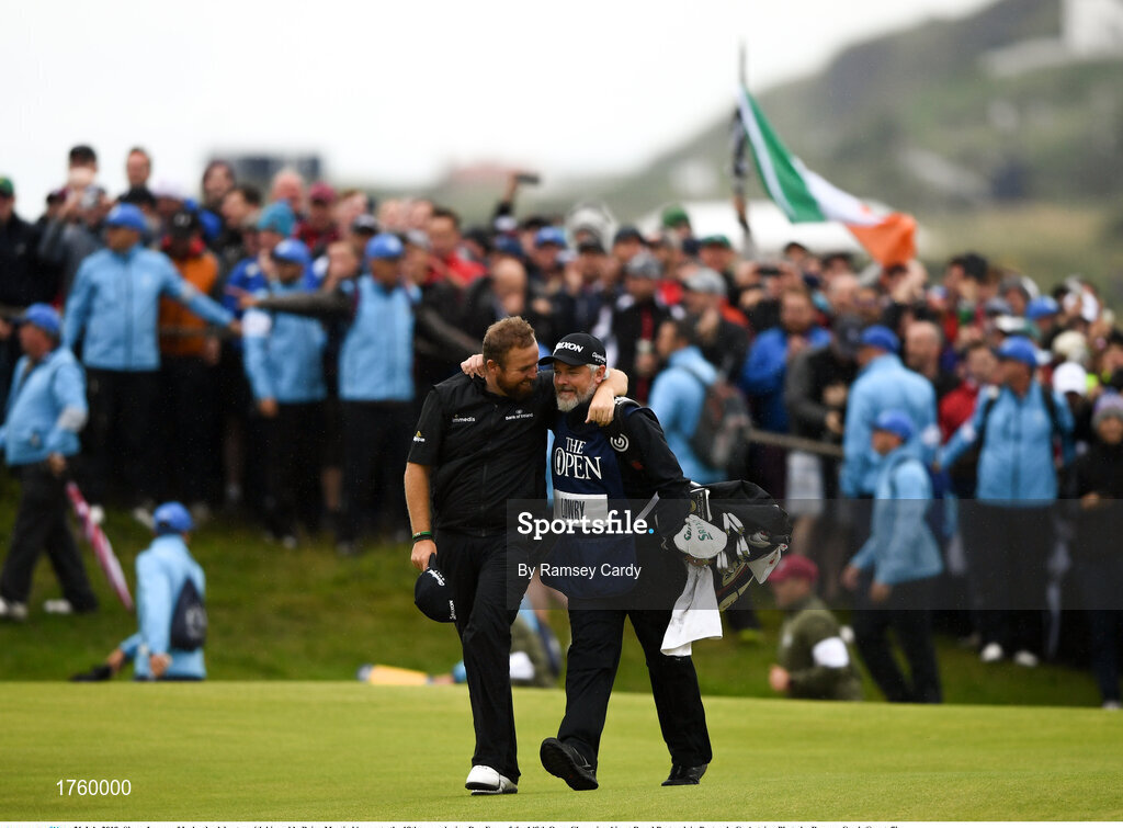 21 July 2019; Shane Lowry of Ireland celebrates with his caddy Brian Martin his way to the 18th green during Day Four of the 148th Open Championship at Royal Portrush in Portrush, Co Antrim. Photo by Ramsey Cardy/Sportsfile