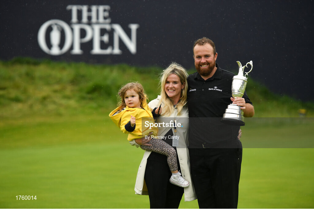 21 July 2019; Shane Lowry of Ireland celebrates with his wife Wendy Honner and daughter Iris and the Claret Jug after winning The Open Championship on Day Four of the 148th Open Championship at Royal Portrush in Portrush, Co Antrim. Photo by Ramsey Cardy/Sportsfile