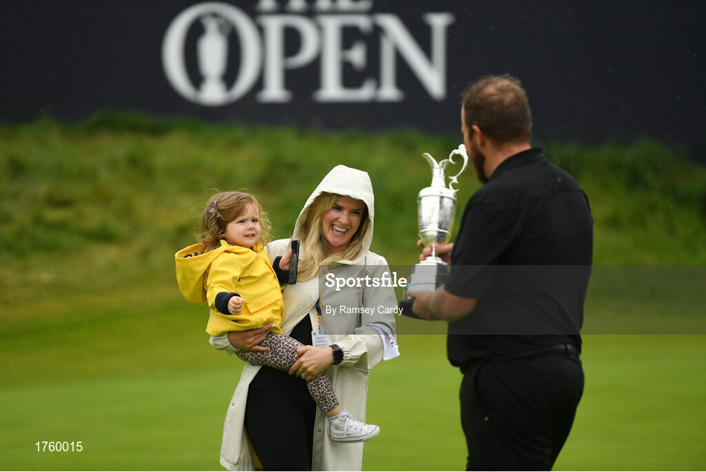 21 July 2019; Shane Lowry of Ireland celebrates with his wife Wendy Honner and daughter Iris and the Claret Jug after winning The Open Championship on Day Four of the 148th Open Championship at Royal Portrush in Portrush, Co Antrim. Photo by Ramsey Cardy/Sportsfile