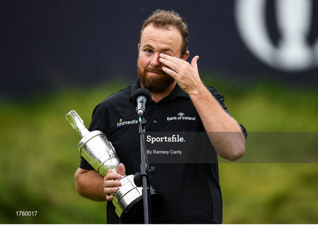 21 July 2019; Shane Lowry of Ireland with The Claret Jug as he makes a speech after winning The Open Championship on Day Four of the 148th Open Championship at Royal Portrush in Portrush, Co Antrim. Photo by Ramsey Cardy/Sportsfile