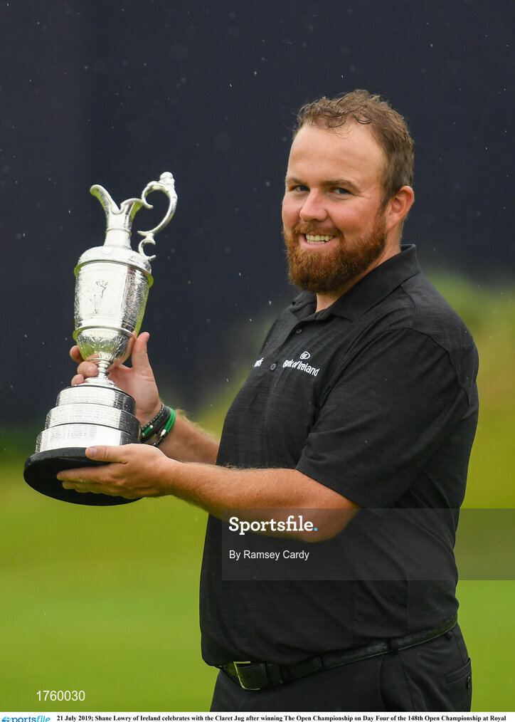 21 July 2019; Shane Lowry of Ireland celebrates with the Claret Jug after winning The Open Championship on Day Four of the 148th Open Championship at Royal Portrush in Portrush, Co Antrim. Photo by Ramsey Cardy/Sportsfile