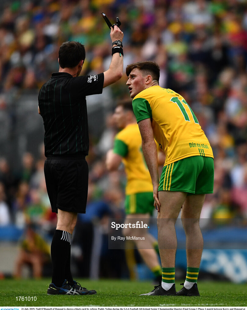21 July 2019; Niall O'Donnell of Donegal is shown a black card by referee Paddy Neilan during the GAA Football All-Ireland Senior Championship Quarter-Final Group 1 Phase 2 match between Kerry and Donegal at Croke Park in Dublin. Photo by Ray McManus/Sportsfile