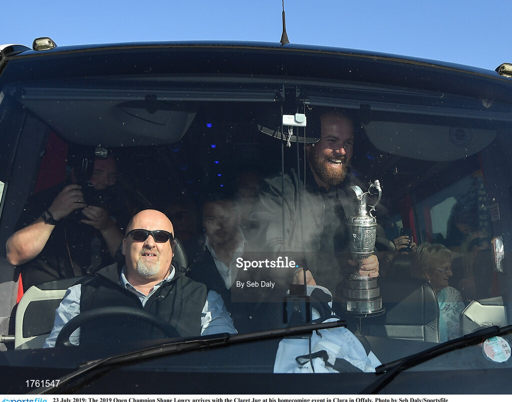 23 July 2019; The 2019 Open Champion Shane Lowry arrives with the Claret Jug at his homecoming event in Clara in Offaly. Photo by Seb Daly/Sportsfile