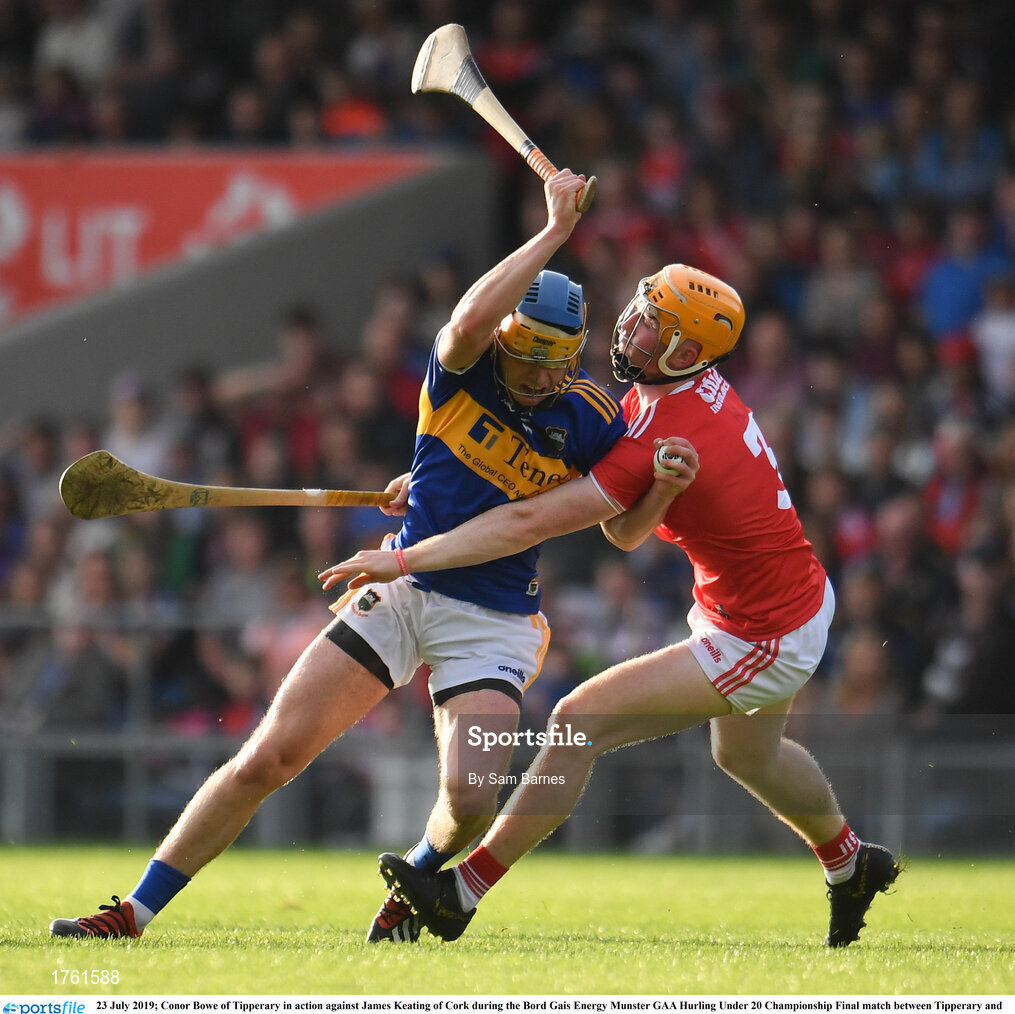 23 July 2019; Conor Bowe of Tipperary in action against James Keating of Cork during the Bord Gais Energy Munster GAA Hurling Under 20 Championship Final match between Tipperary and Cork at Semple Stadium in Thurles, Co Tipperary. Photo by Sam Barnes/Sportsfile