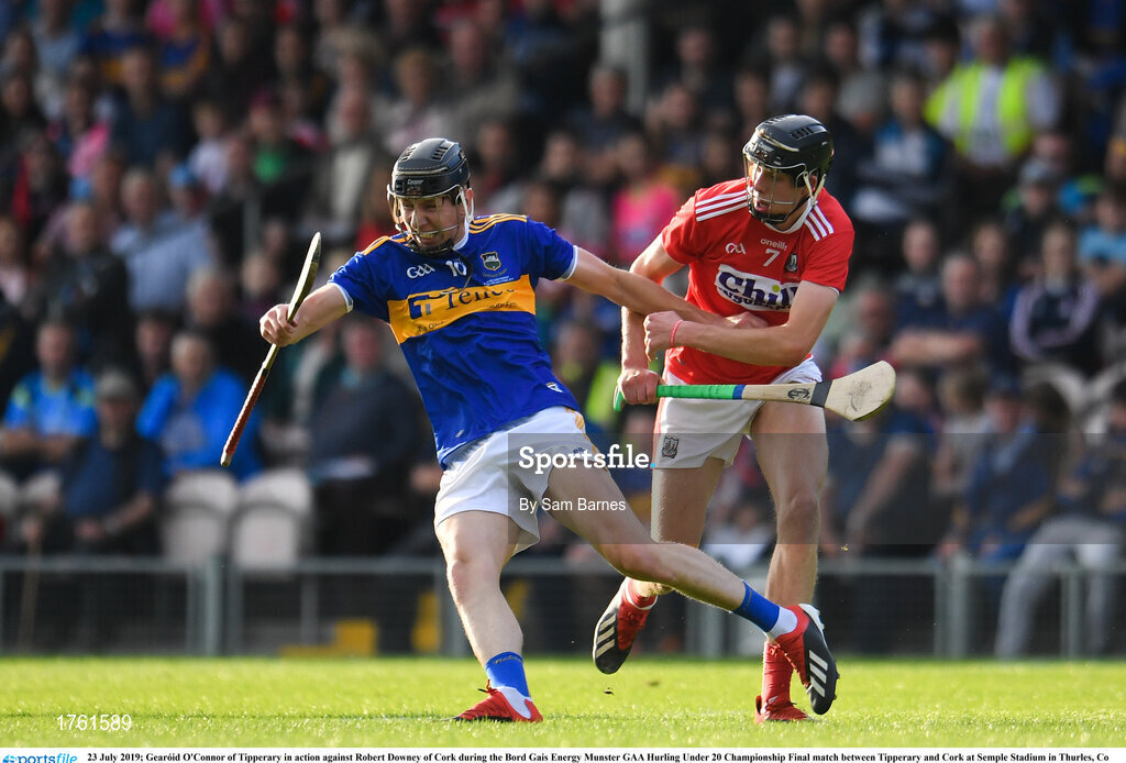 23 July 2019; Gearóid O'Connor of Tipperary in action against Robert Downey of Cork during the Bord Gais Energy Munster GAA Hurling Under 20 Championship Final match between Tipperary and Cork at Semple Stadium in Thurles, Co Tipperary. Photo by Sam Barnes/Sportsfile