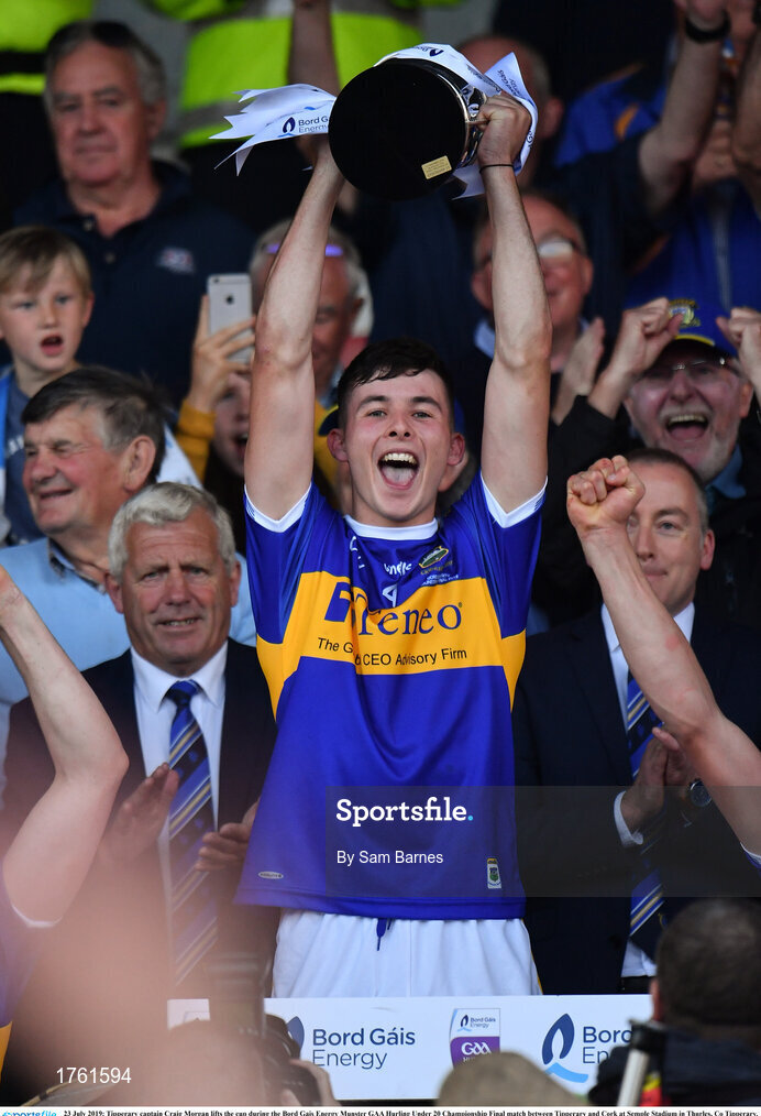 23 July 2019; Tipperary captain Craig Morgan lifts the cup following the Bord Gais Energy Munster GAA Hurling Under 20 Championship Final match between Tipperary and Cork at Semple Stadium in Thurles, Co Tipperary. Photo by Sam Barnes/Sportsfile