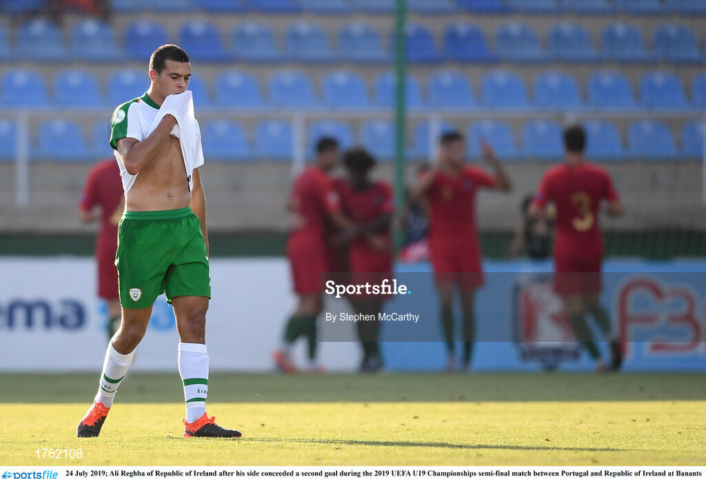 24 July 2019; Ali Reghba of Republic of Ireland after his side conceded a second goal during the 2019 UEFA U19 Championships semi-final match between Portugal and Republic of Ireland at Banants Stadium in Yerevan, Armenia. Photo by Stephen McCarthy/Sportsfile