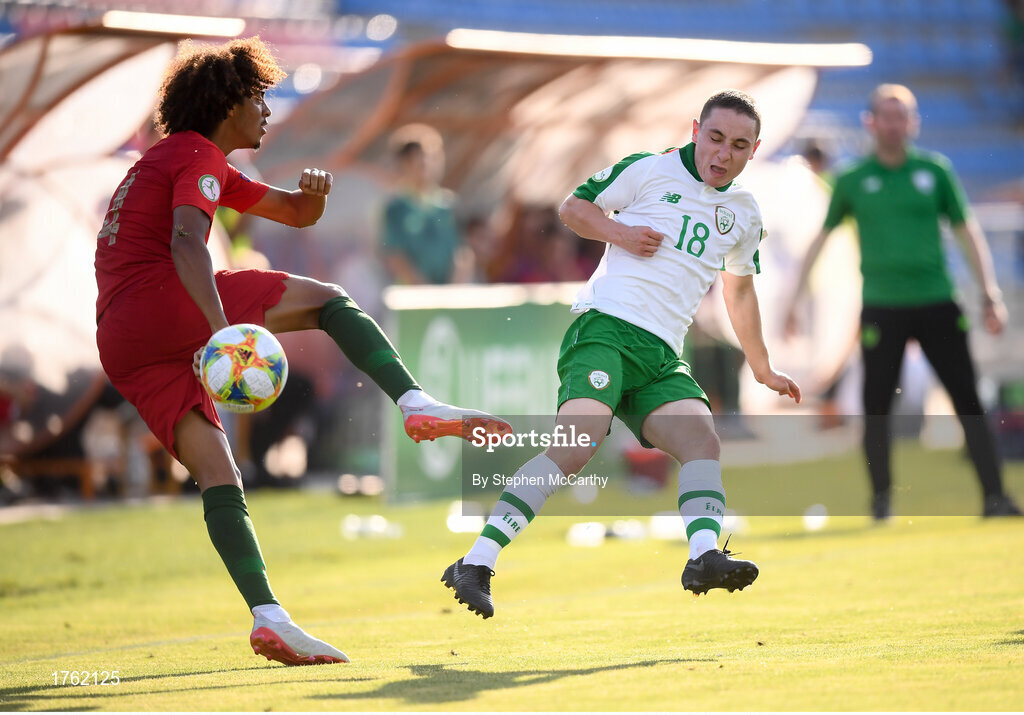 24 July 2019; Joe Hodge of Republic of Ireland and Tomás Tavares of Portugal during the 2019 UEFA U19 Championships semi-final match between Portugal and Republic of Ireland at Banants Stadium in Yerevan, Armenia. Photo by Stephen McCarthy/Sportsfile