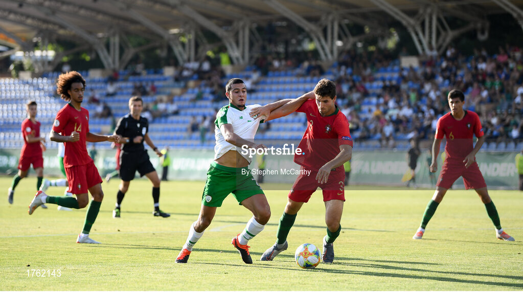 24 July 2019; Ali Reghba of Republic of Ireland and Gonçalo Loureiro of Portugal during the 2019 UEFA U19 Championships semi-final match between Portugal and Republic of Ireland at Banants Stadium in Yerevan, Armenia. Photo by Stephen McCarthy/Sportsfile