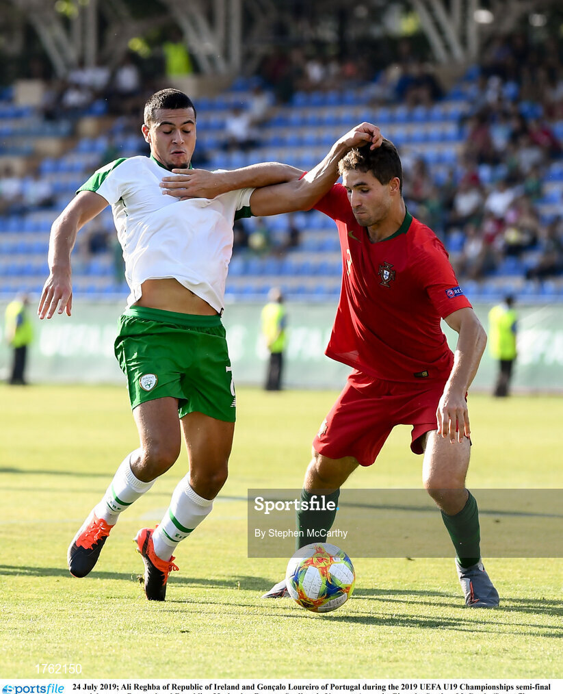 24 July 2019; Ali Reghba of Republic of Ireland and Gonçalo Loureiro of Portugal during the 2019 UEFA U19 Championships semi-final match between Portugal and Republic of Ireland at Banants Stadium in Yerevan, Armenia. Photo by Stephen McCarthy/Sportsfile