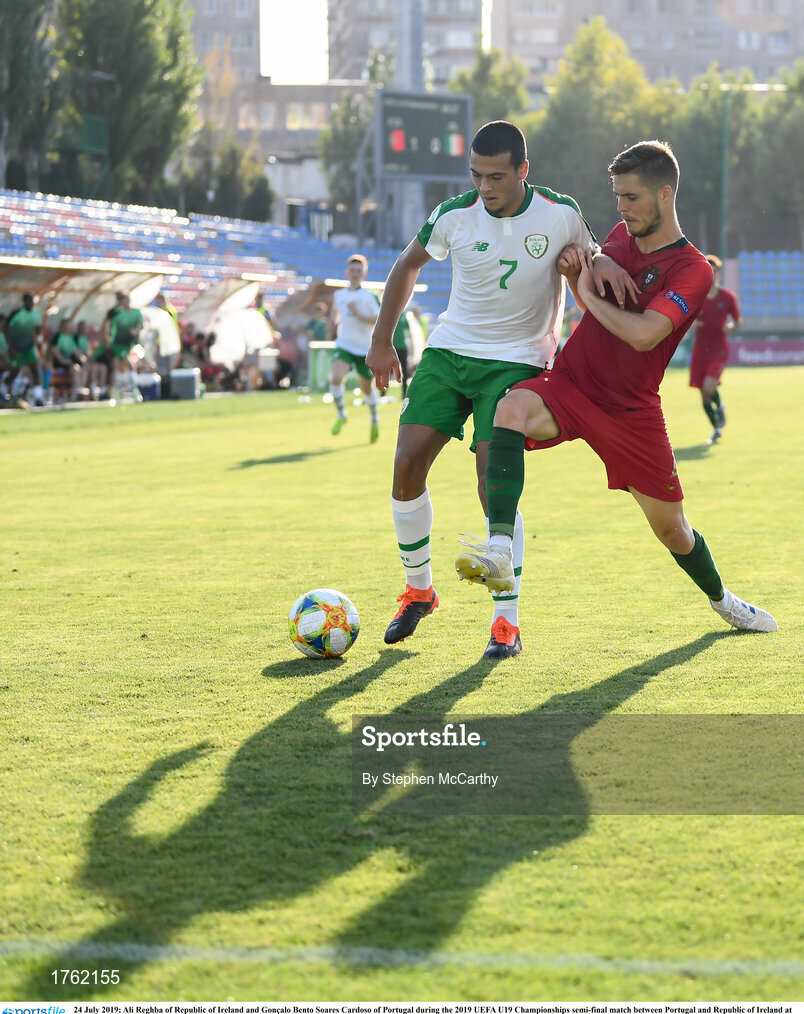 24 July 2019; Ali Reghba of Republic of Ireland and Gonçalo Bento Soares Cardoso of Portugal during the 2019 UEFA U19 Championships semi-final match between Portugal and Republic of Ireland at Banants Stadium in Yerevan, Armenia. Photo by Stephen McCarthy/Sportsfile