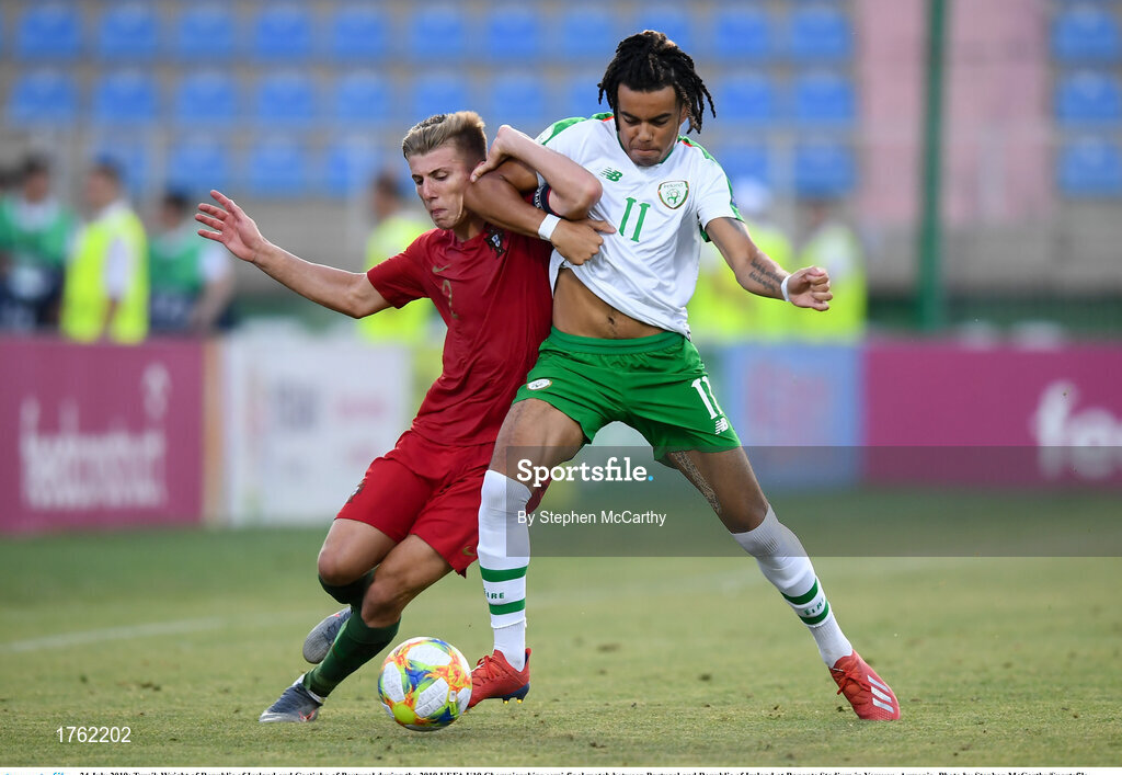 24 July 2019; Tyreik Wright of Republic of Ireland and Costinha of Portugal during the 2019 UEFA U19 Championships semi-final match between Portugal and Republic of Ireland at Banants Stadium in Yerevan, Armenia. Photo by Stephen McCarthy/Sportsfile
