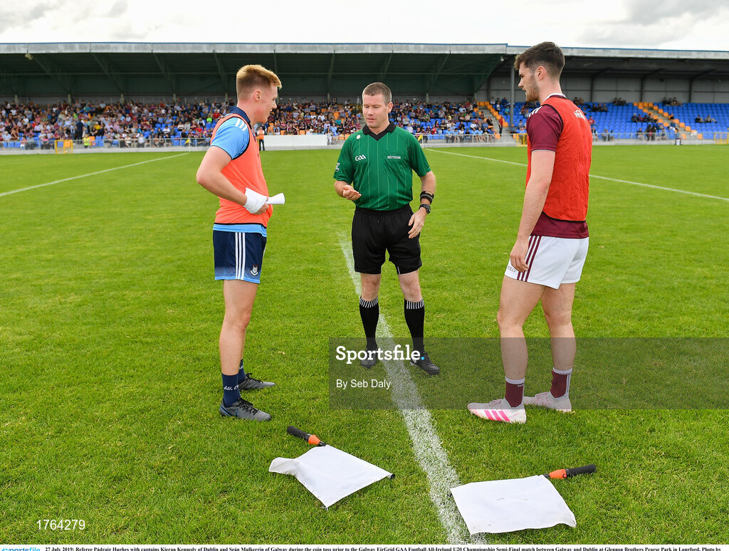27 July 2019; Referee Pádraig Hughes with captains Kieran Kennedy of Dublin and Seán Mulkerrin of Galway during the coin toss prior to the Galway EirGrid GAA Football All-Ireland U20 Championship Semi-Final match between Galway and Dublin at Glennon Brothers Pearse Park in Longford. Photo by Seb Daly/Sportsfile