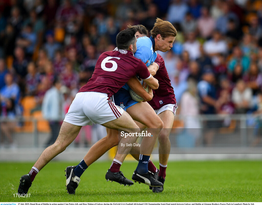 27 July 2019; Donal Ryan of Dublin in action against Cian Potter, left, and Ross Mahon of Galway during the EirGrid GAA Football All-Ireland U20 Championship Semi-Final match between Galway and Dublin at Glennon Brothers Pearse Park in Longford. Photo by Seb Daly/Sportsfile
