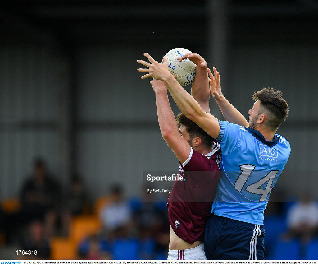 27 July 2019; Ciarán Archer of Dublin in action against Seán Mulkerrin of Galway during the EirGrid GAA Football All-Ireland U20 Championship Semi-Final match between Galway and Dublin at Glennon Brothers Pearse Park in Longford. Photo by Seb Daly/Sportsfile