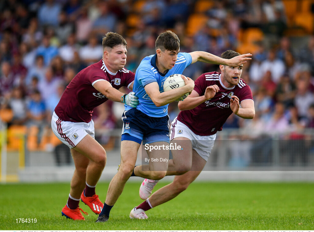 27 July 2019; Brian O'Leary of Dublin in action against Brian Harlowe, left, and Jack Kirrane of Galway during the EirGrid GAA Football All-Ireland U20 Championship Semi-Final match between Galway and Dublin at Glennon Brothers Pearse Park in Longford. Photo by Seb Daly/Sportsfile
