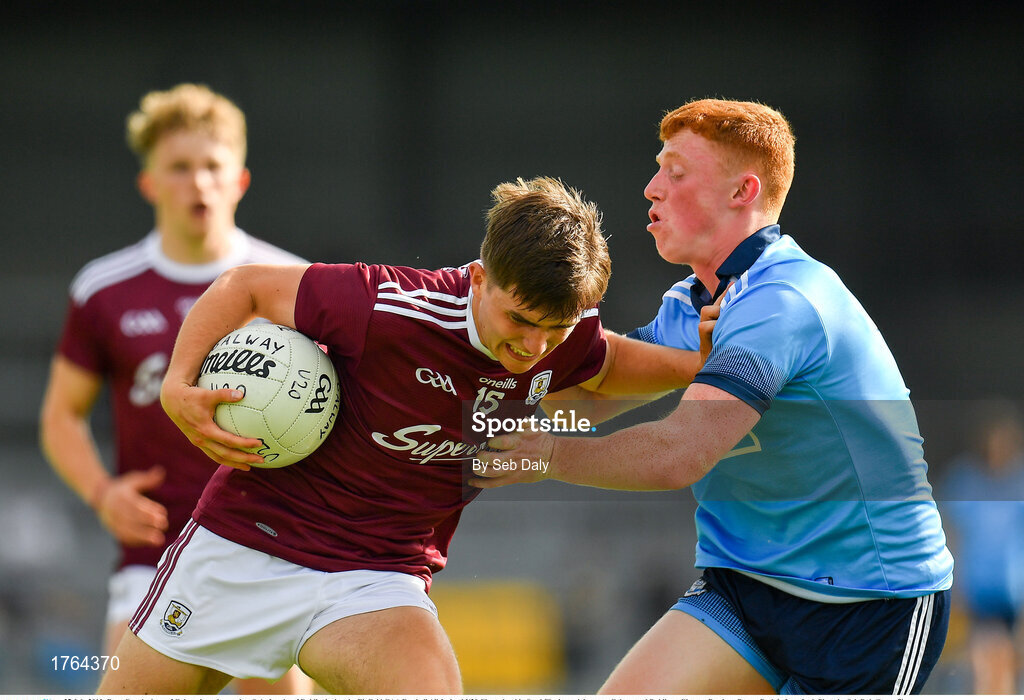 27 July 2019; Rory Cunningham of Galway in action against Seán Lambe of Dublin during the EirGrid GAA Football All-Ireland U20 Championship Semi-Final match between Galway and Dublin at Glennon Brothers Pearse Park in Longford. Photo by Seb Daly/Sportsfile