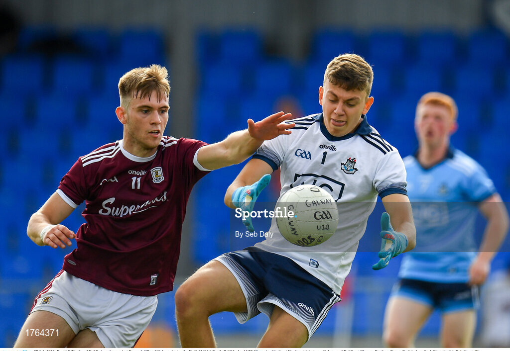 27 July 2019; David O'Hanlon of Dublin in action against Darragh Silke of Galway during the EirGrid GAA Football All-Ireland U20 Championship Semi-Final match between Galway and Dublin at Glennon Brothers Pearse Park in Longford. Photo by Seb Daly/Sportsfile