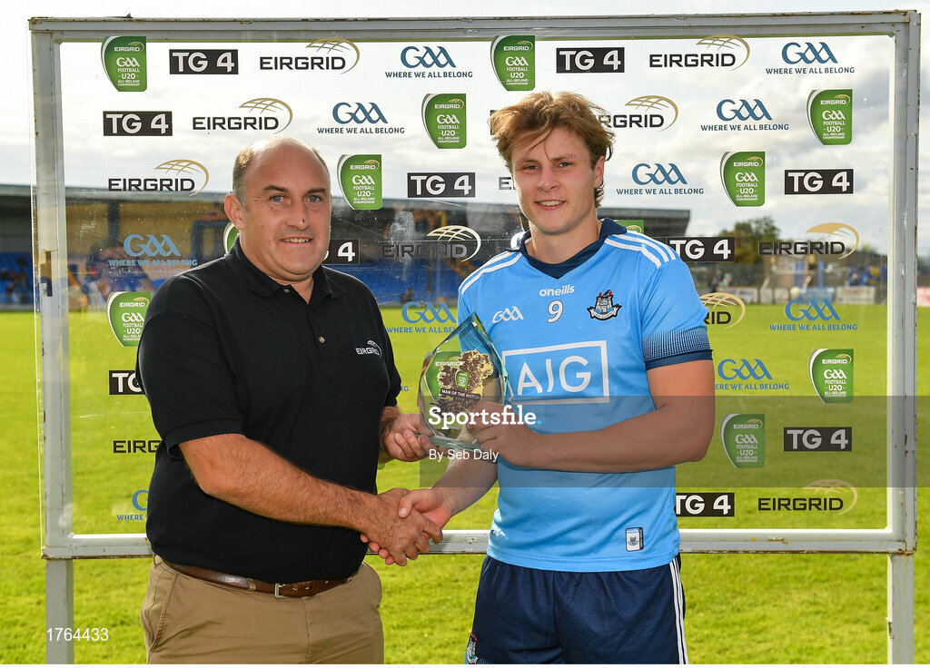 27 July 2019; Donal Ryan of Dublin is presented with the Man of the Match award by Aidan Naughton, EirGred, following the EirGrid GAA Football All-Ireland U20 Championship Semi-Final match between Galway and Dublin at Glennon Brothers Pearse Park in Longford. Photo by Seb Daly/Sportsfile