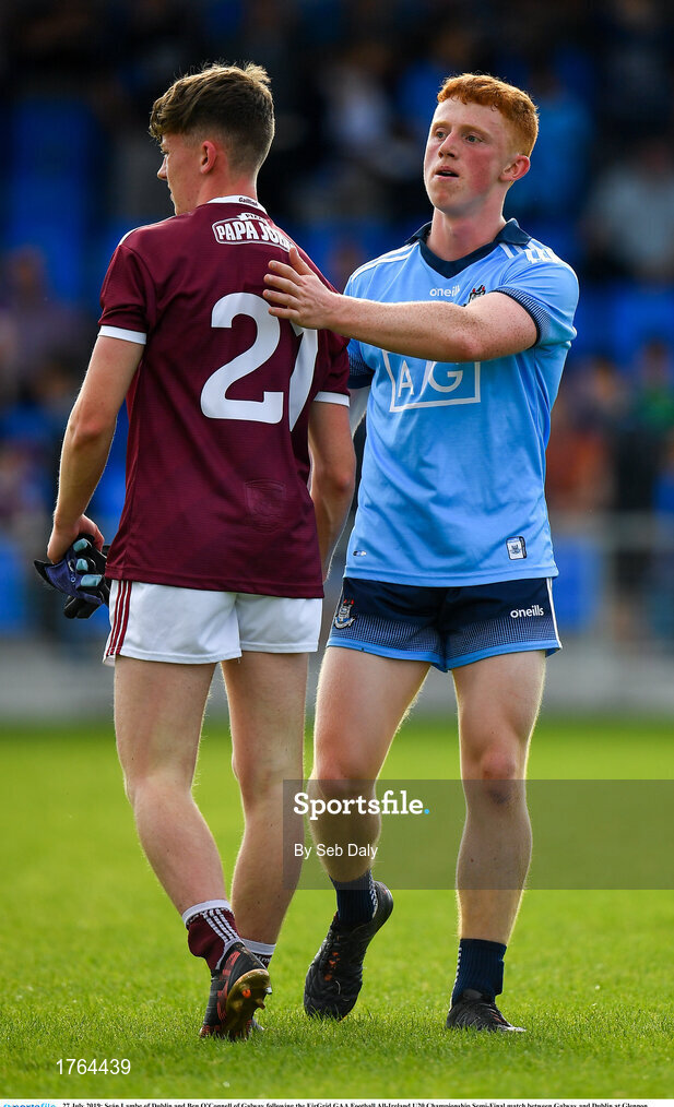 27 July 2019; Seán Lambe of Dublin and Ben O’Connell of Galway following the EirGrid GAA Football All-Ireland U20 Championship Semi-Final match between Galway and Dublin at Glennon Brothers Pearse Park in Longford. Photo by Seb Daly/Sportsfile