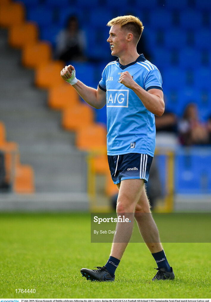 27 July 2019; Kieran Kennedy of Dublin celebrates following his side's victory during the EirGrid GAA Football All-Ireland U20 Championship Semi-Final match between Galway and Dublin at Glennon Brothers Pearse Park in Longford. Photo by Seb Daly/Sportsfile