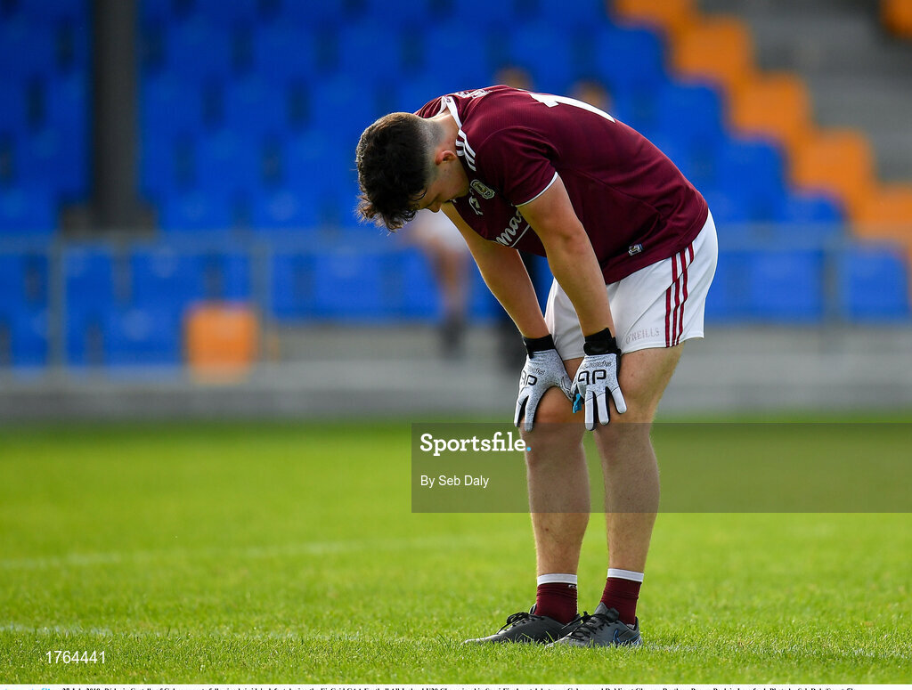 27 July 2019; Pádraig Costello of Galway reacts following hsi side's defeat during the EirGrid GAA Football All-Ireland U20 Championship Semi-Final match between Galway and Dublin at Glennon Brothers Pearse Park in Longford. Photo by Seb Daly/Sportsfile