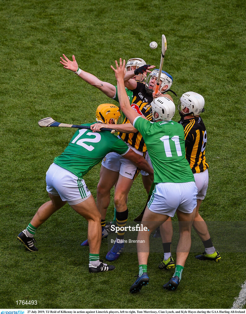 27 July 2019; TJ Reid of Kilkenny in action against Limerick players, left to right, Tom Morrissey, Cian Lynch, and Kyle Hayes during the GAA Hurling All-Ireland Senior Championship Semi-Final match between Kilkenny and Limerick at Croke Park in Dublin. Photo by Daire Brennan/Sportsfile