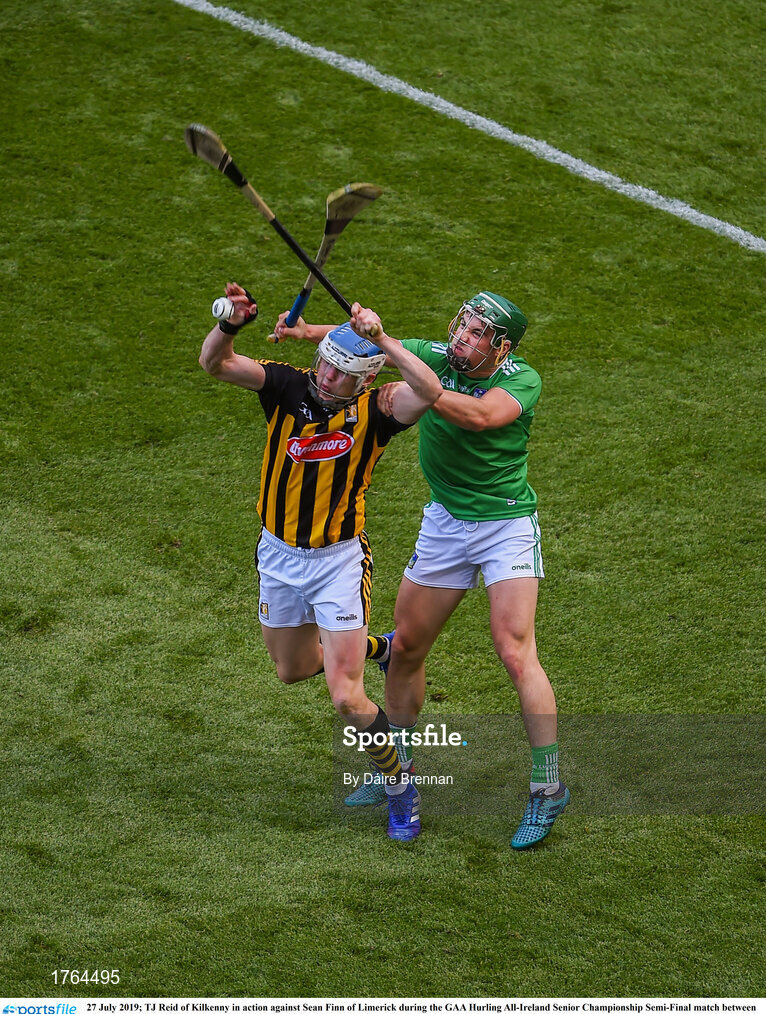 27 July 2019; TJ Reid of Kilkenny in action against Sean Finn of Limerick during the GAA Hurling All-Ireland Senior Championship Semi-Final match between Kilkenny and Limerick at Croke Park in Dublin. Photo by Daire Brennan/Sportsfile