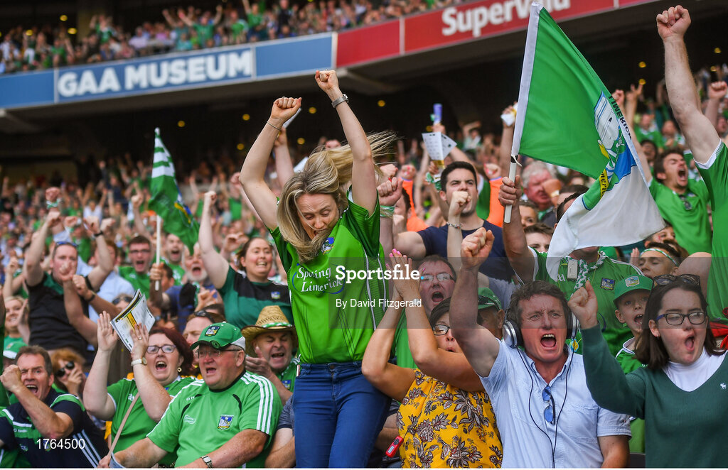 27 July 2019; Limerick fans celebrate their side's first goal scored by Aaron Gillane during the GAA Hurling All-Ireland Senior Championship Semi-Final match between Kilkenny and Limerick at Croke Park in Dublin. Photo by David Fitzgerald/Sportsfile