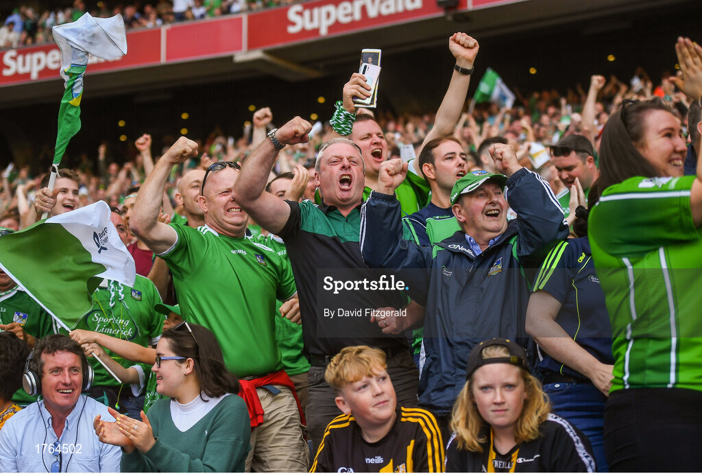 27 July 2019; Limerick fans celebrate their side's first goal scored by Aaron Gillane during the GAA Hurling All-Ireland Senior Championship Semi-Final match between Kilkenny and Limerick at Croke Park in Dublin. Photo by David Fitzgerald/Sportsfile