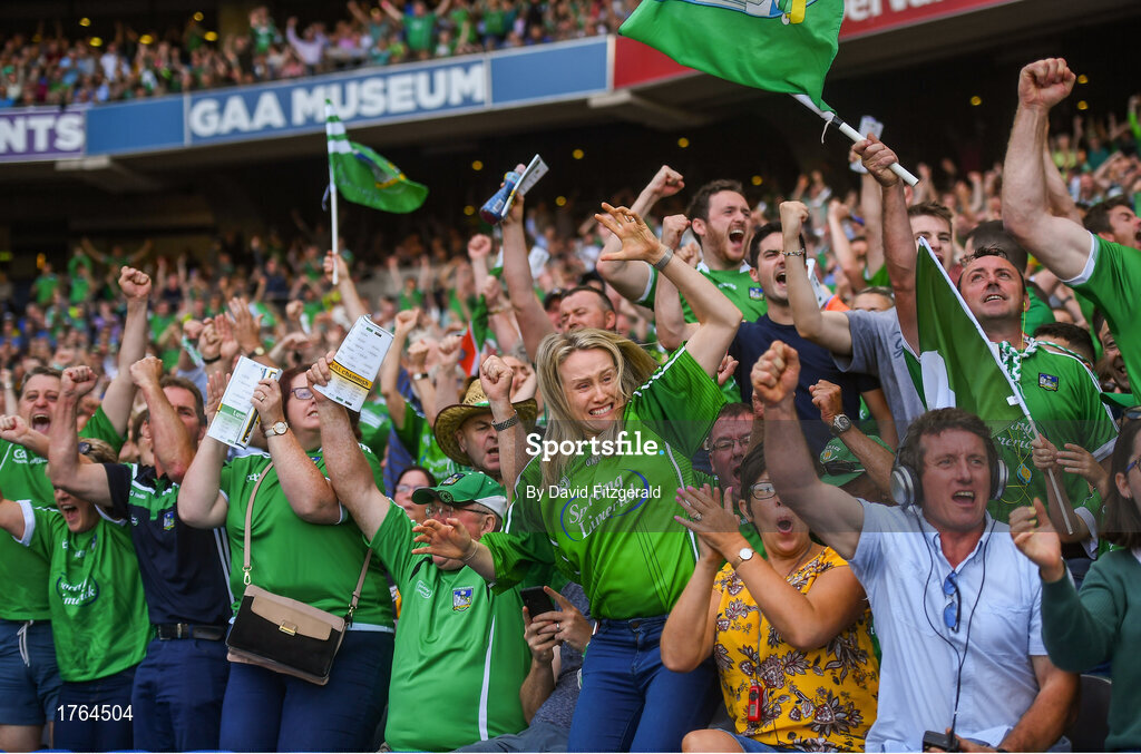 27 July 2019; Limerick fans celebrate their side's first goal scored by Aaron Gillane during the GAA Hurling All-Ireland Senior Championship Semi-Final match between Kilkenny and Limerick at Croke Park in Dublin. Photo by David Fitzgerald/Sportsfile