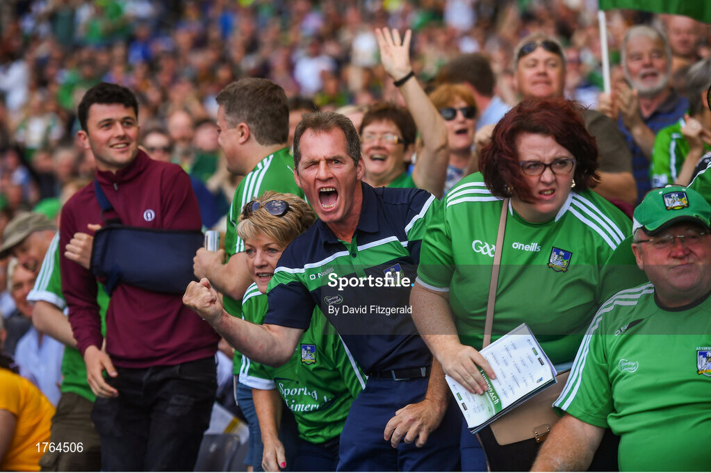 27 July 2019; Limerick fans celebrate their side's first goal scored by Aaron Gillane during the GAA Hurling All-Ireland Senior Championship Semi-Final match between Kilkenny and Limerick at Croke Park in Dublin. Photo by David Fitzgerald/Sportsfile