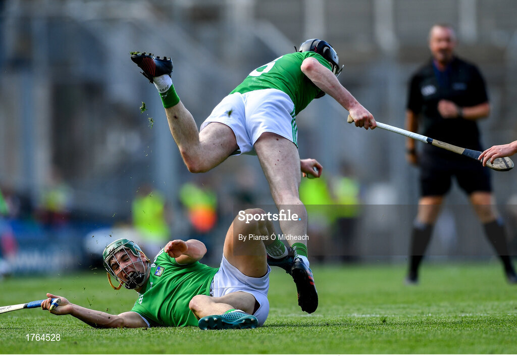 27 July 2019; Declan Hannon of Limerick trips over team-mate Seán Finn during the GAA Hurling All-Ireland Senior Championship Semi-Final match between Kilkenny and Limerick at Croke Park in Dublin. Photo by Piaras Ó Mídheach/Sportsfile