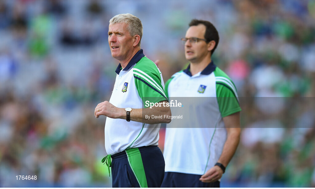 27 July 2019; Limerick manager John Kiely, left, and selector Paul Kinnerk during the GAA Hurling All-Ireland Senior Championship Semi-Final match between Kilkenny and Limerick at Croke Park in Dublin. Photo by David Fitzgerald/Sportsfile