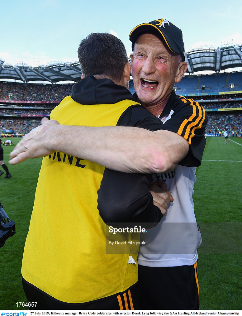 27 July 2019; Kilkenny manager Brian Cody celebrates with selector Derek Lyng following the GAA Hurling All-Ireland Senior Championship Semi-Final match between Kilkenny and Limerick at Croke Park in Dublin. Photo by David Fitzgerald/Sportsfile