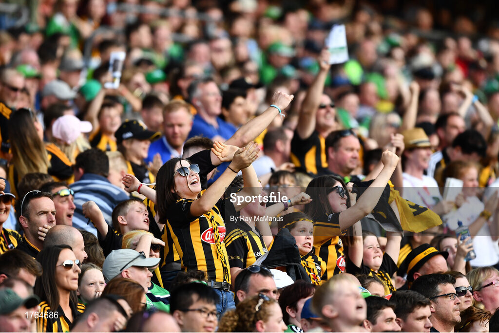 27 July 2019; Kilkenny supporters, in the Cusack Stand, celebrate a score during the GAA Hurling All-Ireland Senior Championship Semi-Final match between Kilkenny and Limerick at Croke Park in Dublin. Photo by Ray McManus/Sportsfile