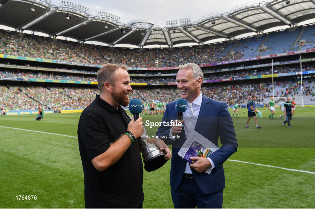 27 July 2019; The 2019 Open Champion Shane Lowry with the Claret Jug is interviewed by Dáithí Ó Sé ahead of the GAA Hurling All-Ireland Senior Championship Semi-Final match between Kilkenny and Limerick at Croke Park in Dublin. Photo by Ramsey Cardy/Sportsfile