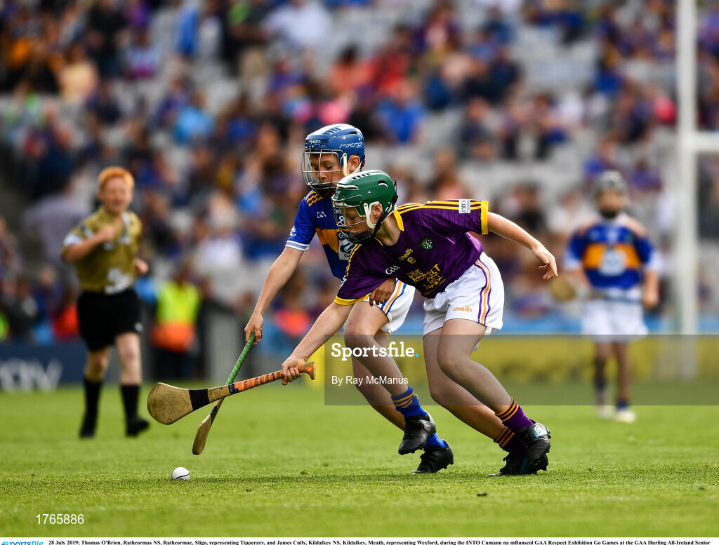 28 July 2019; Thomas O'Brien, Rathcormas NS, Rathcormac, Sligo, representing Tipperary, and James Cully, Kildalkey NS, Kildalkey, Meath, representing Wexford, during the INTO Cumann na mBunscol GAA Respect Exhibition Go Games at the GAA Hurling All-Ireland Senior Championship Semi Final match between Wexford and Tipperary at Croke Park in Dublin. Photo by Ray McManus/Sportsfile
