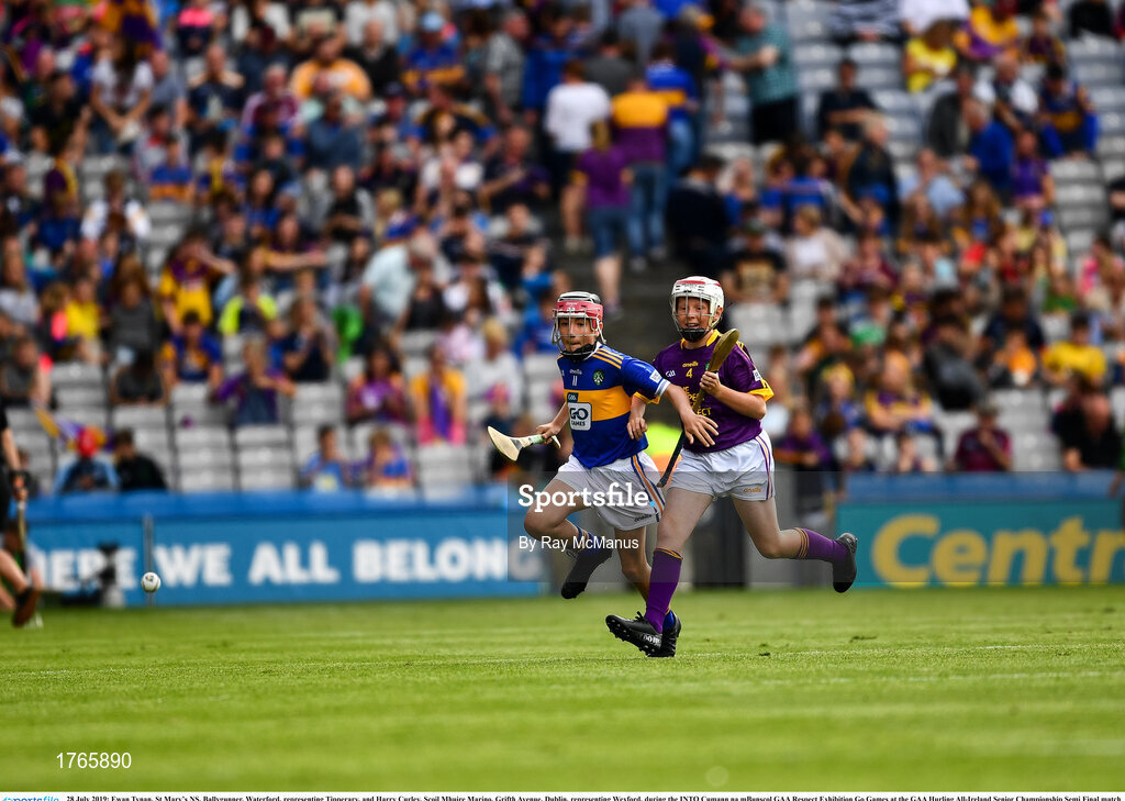 28 July 2019; Ewan Tynan, St Mary’s NS, Ballygunner, Waterford, representing Tipperary, and Harry Curley, Scoil Mhuire Marino, Grifth Avenue, Dublin, representing Wexford, during the INTO Cumann na mBunscol GAA Respect Exhibition Go Games at the GAA Hurling All-Ireland Senior Championship Semi Final match between Wexford and Tipperary at Croke Park in Dublin. Photo by Ray McManus/Sportsfile