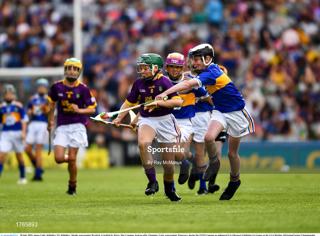 28 July 2019; James Cully, Kildalkey NS, Kildalkey, Meath, representing Wexford, is tackled by Harry Mac Canainn, Scoil na nÓg, Glanmire, Cork, representing Tipperary, during the INTO Cumann na mBunscol GAA Respect Exhibition Go Games at the GAA Hurling All-Ireland Senior Championship Semi Final match between Wexford and Tipperary at Croke Park in Dublin. Photo by Ray McManus/Sportsfile