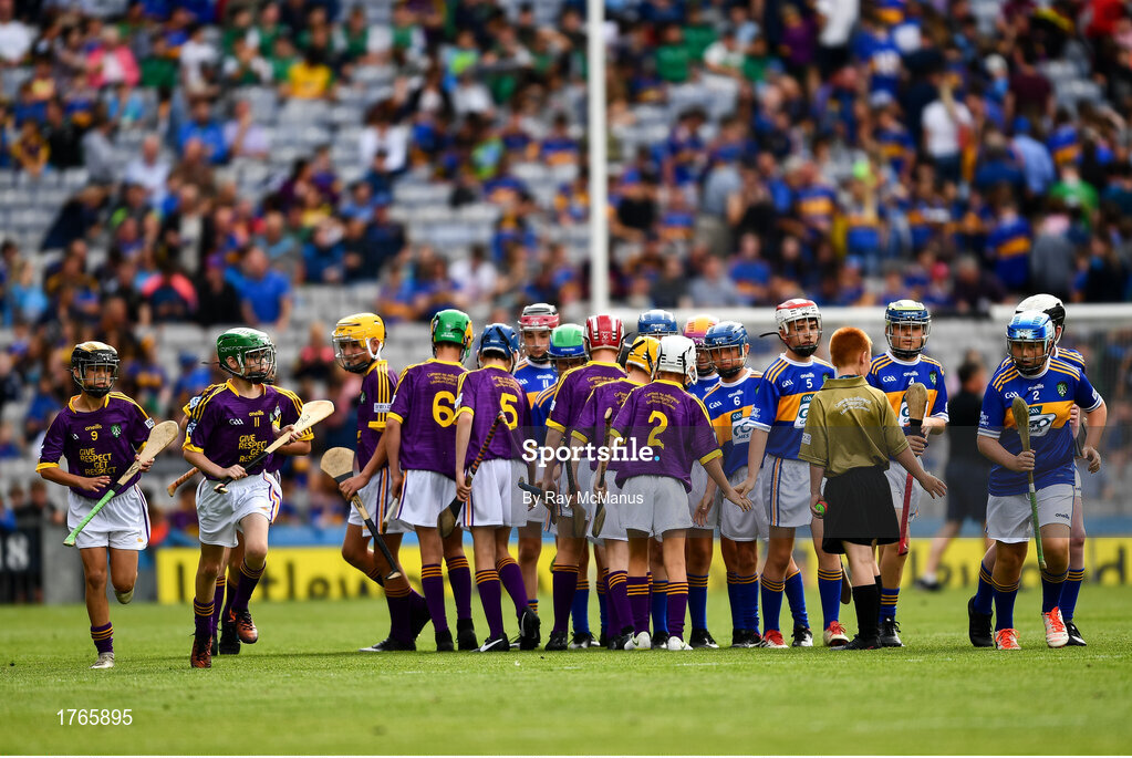28 July 2019; The teams on parade before the INTO Cumann na mBunscol GAA Respect Exhibition Go Games at the GAA Hurling All-Ireland Senior Championship Semi Final match between Wexford and Tipperary at Croke Park in Dublin. Photo by Ray McManus/Sportsfile