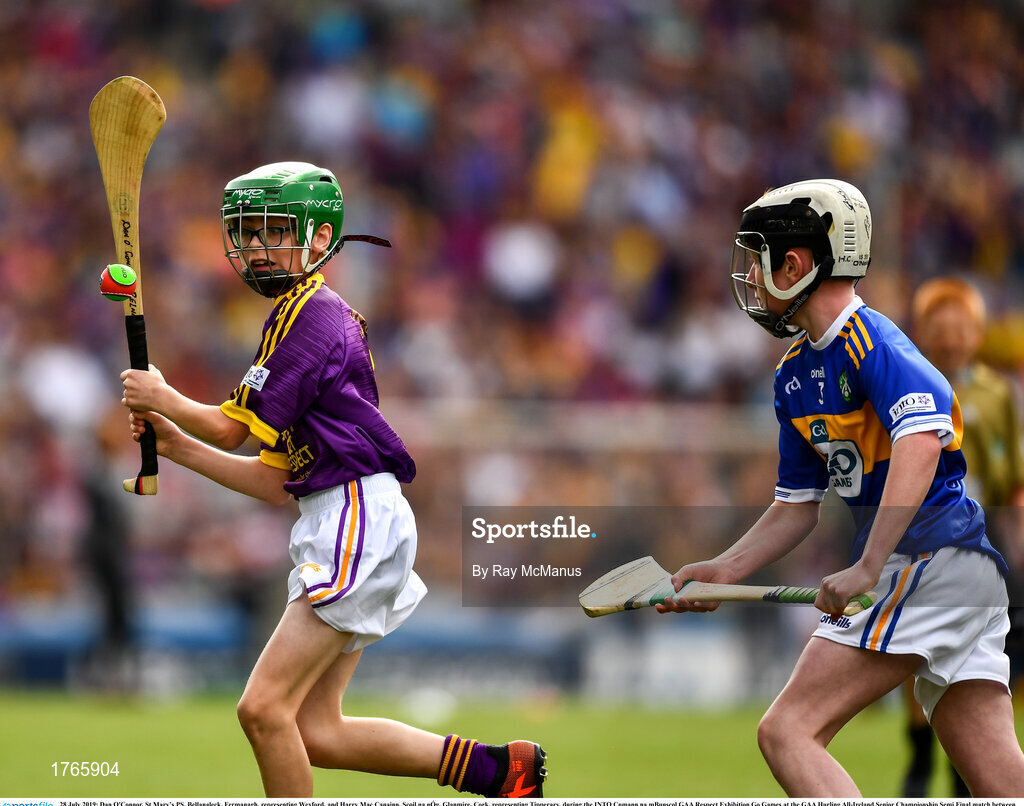 28 July 2019; Dan O'Connor, St Mary’s PS, Bellanaleck, Fermanagh, representing Wexford, and Harry Mac Canainn, Scoil na nÓg, Glanmire, Cork, representing Tipperary, during the INTO Cumann na mBunscol GAA Respect Exhibition Go Games at the GAA Hurling All-Ireland Senior Championship Semi Final match between Wexford and Tipperary at Croke Park in Dublin. Photo by Ray McManus/Sportsfile