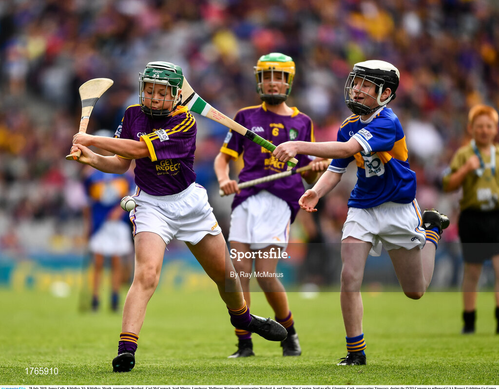 28 July 2019; James Cully, Kildalkey NS, Kildalkey, Meath, representing Wexford,, Carl McCormack, Scoil Mhuire, Loughegar, Mullingar, Westmeath, representing Wexford, 6, and Harry Mac Canainn, Scoil na nÓg, Glanmire, Cork, representing Tipperary, during the INTO Cumann na mBunscol GAA Respect Exhibition Go Games at the GAA Hurling All-Ireland Senior Championship Semi Final match between Wexford and Tipperary at Croke Park in Dublin. Photo by Ray McManus/Sportsfile