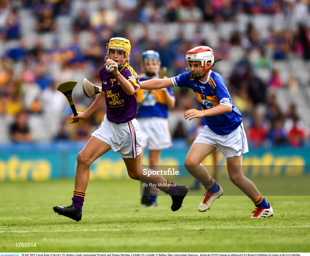 28 July 2019; Ciaran King, St Kevin’s NS, Dunleer, Louth, representing Wexford, and Thomas Sheridan, Corballa NS, Corballa, Vi Ballina, Sligo, representing Tipperary, during the INTO Cumann na mBunscol GAA Respect Exhibition Go Games at the GAA Hurling All-Ireland Senior Championship Semi Final match between Wexford and Tipperary at Croke Park in Dublin. Photo by Ray McManus/Sportsfile