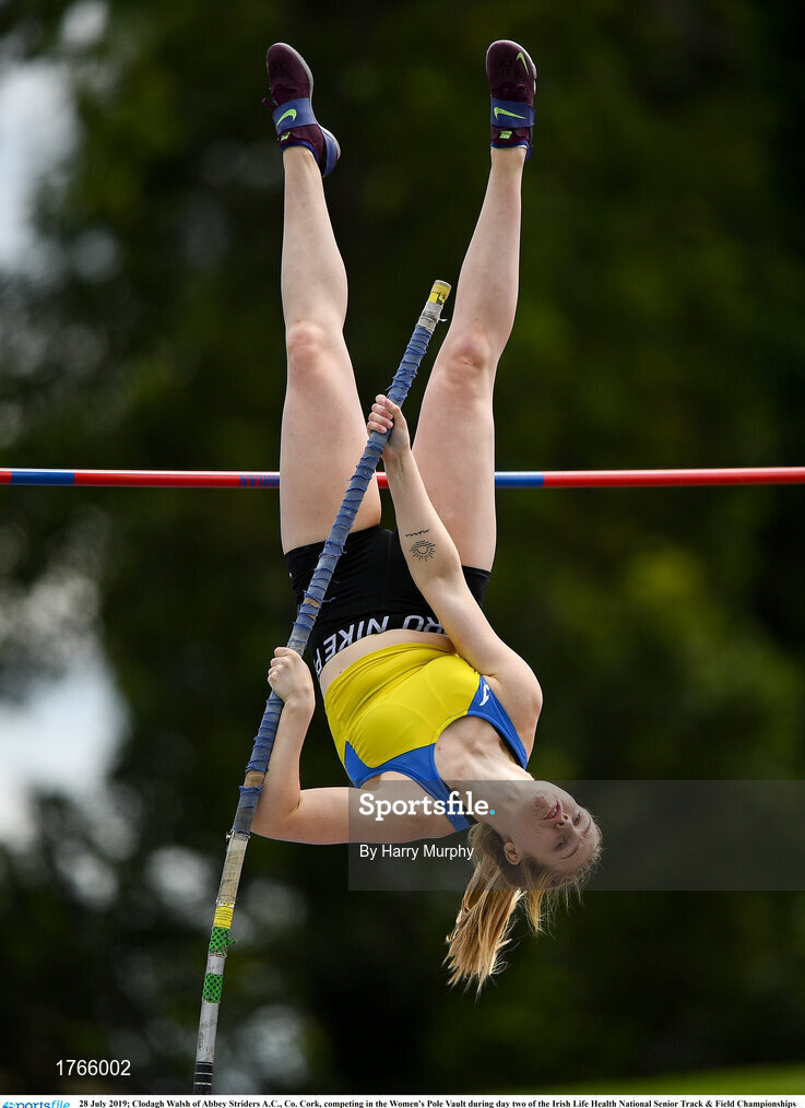 28 July 2019; Clodagh Walsh of Abbey Striders A.C., Co. Cork, competing in the Women's Pole Vault during day two of the Irish Life Health National Senior Track & Field Championships at Morton Stadium in Santry, Dublin. Photo by Harry Murphy/Sportsfile